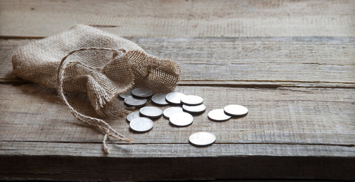 Thirty coins in a bag on the table