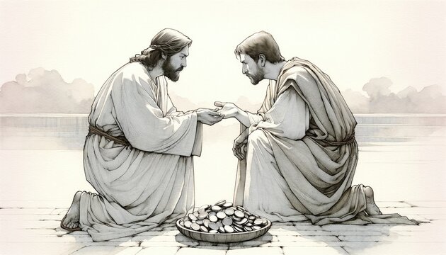 The betrayal of Judas. Judas agreeing to betray Jesus for thirty pieces of silver. Life of Jesus. Digital illustration.