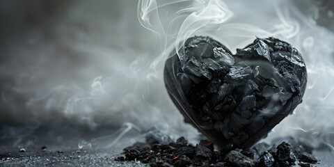 Black heart with cooling coals and white smoke symbolizing relationship breakup. Concept Breakup Symbolism, Emotional Imagery, Heartache Concept, Moving On Visuals