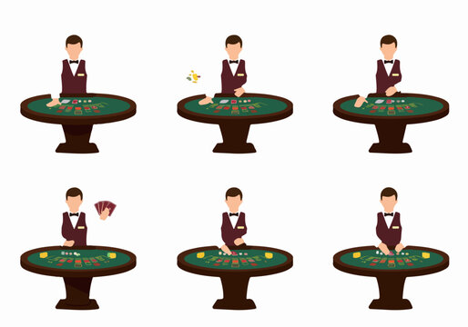 Casino dealer at gaming table with chips and cards