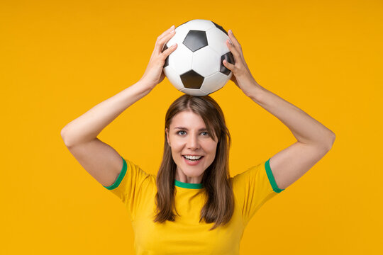 Young woman on yellow studio background holding soccer ball above her head, celebrating the spirit of the game, sports victory, and the thrill of betting and winning in a bold, energetic pose