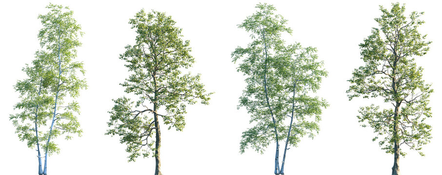 Set of 2 of Betula populifolia (sweet birch, also known as black birch) and 2 Populus cathayana isolated png in sunny daylight on a transparent background perfectly cutout