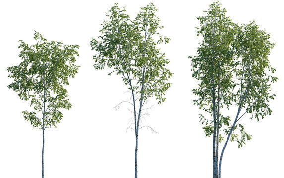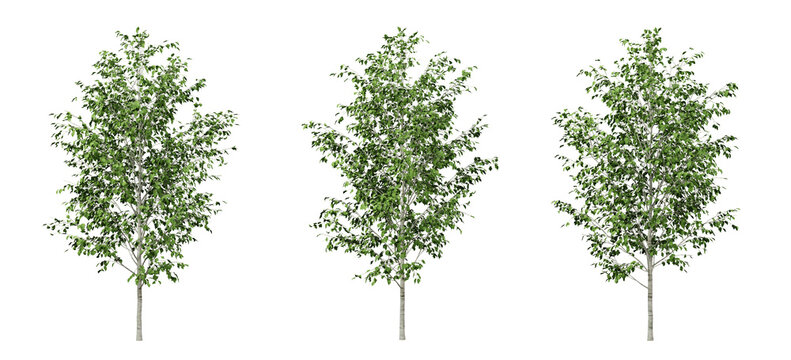 Green betula utilis trees on transparent background, 3d render illustration.