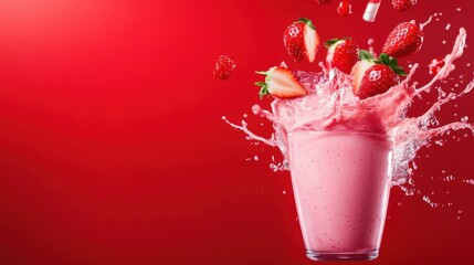 Pink beverage splashing in a glass, vibrant background highlighting freshness, perfect for advertising summer drinks.