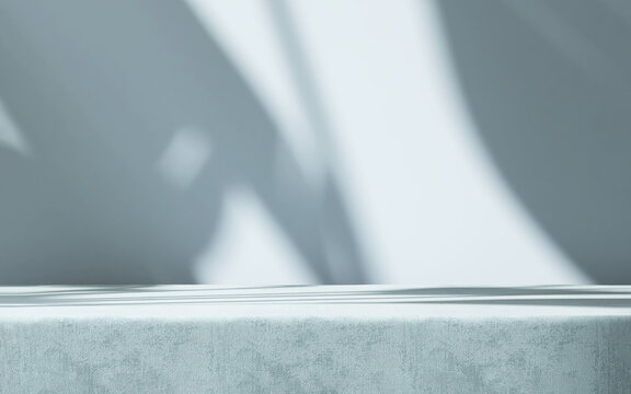 Table countertop, turquoise flannel velvet tablecloth in sunlight, tropical leaf shadow on blank blue wall in background for luxury food, beverage, nature, organic beauty cosmetic product display 3D