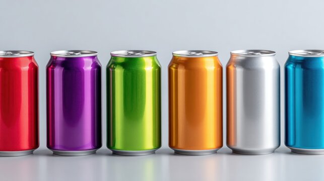 Colorful aluminum beverage cans in a row