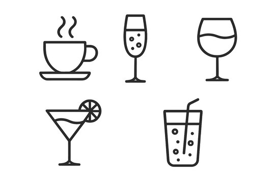 Drink and beverage line icon set. Coffee, champagne, wine, cocktail, soda. Simple outline symbol collection for bar, cafe menu. Vector graphic with editable stroke.