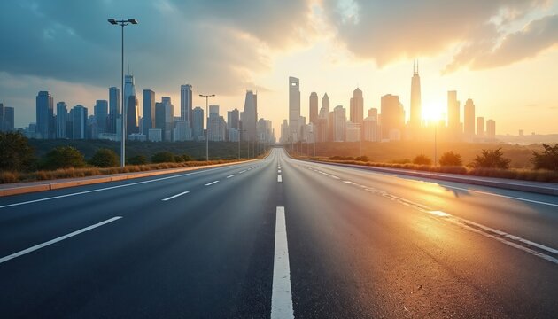 Open road leads to city skyline at sunrise with sun flare. Modern buildings rise beyond green hills and empty highway. Cityscape emerges in bright morning light.