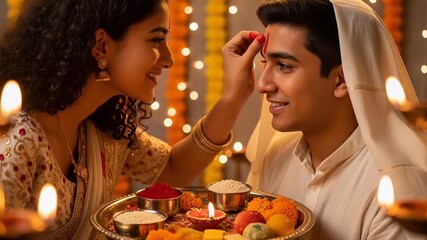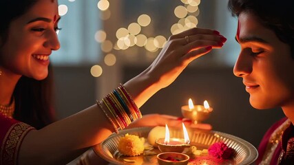Sister Applying Tilak or Tika on Brother Forehead During Bhai Dooj Festival after Diwali