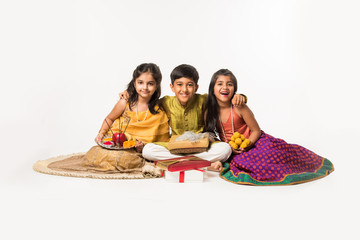 3 indian kids or siblings in traditional wear sitting on sofa or white background, holding gifts and sweets or laddu