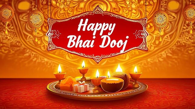 happy bhai dooj celebration card with candle and food in golden mandalas