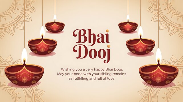 Happy bhai dooj festival with glowing diyas and ornate pattern on beige background