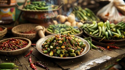 Bhindi masala, spiced okra curry, served on a rustic plate with a bustling Indian vegetable market scene