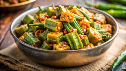 Delicious vegetarian bhindi masala stir fry with fresh okra on white plate. Bursting with flavor and spices, perfect for lunch or dinner. Top-down view offers tantalizing glimpse