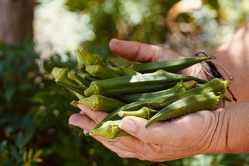 Close-up of female hands holding fresh green okra.