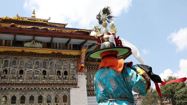 Performers dancers wearing masks in festival in Mongar, Bhutan