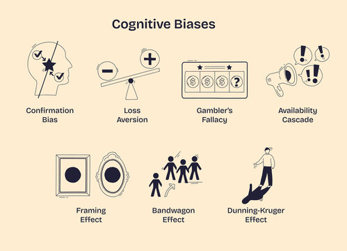 Cognitive biases are illustrated with simple icons showing concepts like confirmation bias, loss aversion, and gamblers fallacy. Doodle style diagram