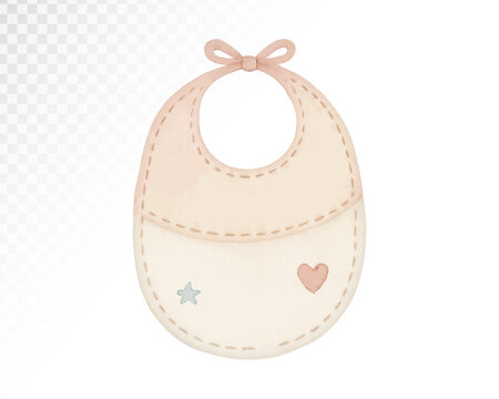 Watercolor beige baby bib with stitched heart and star details, perfect for baby shower designs, feeding accessories, and infant care themes. Vector illustration.