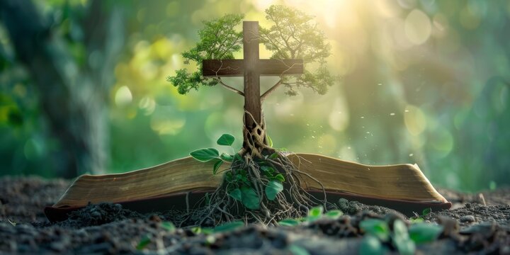 Abstract Typography: Living Word Visualized. Dynamic Cross Rooted in Open Bible, Symbolizing Faith's Growth Nourished by Scripture. Artistic Representation of Spiritual Vitality and Biblical Foundatio