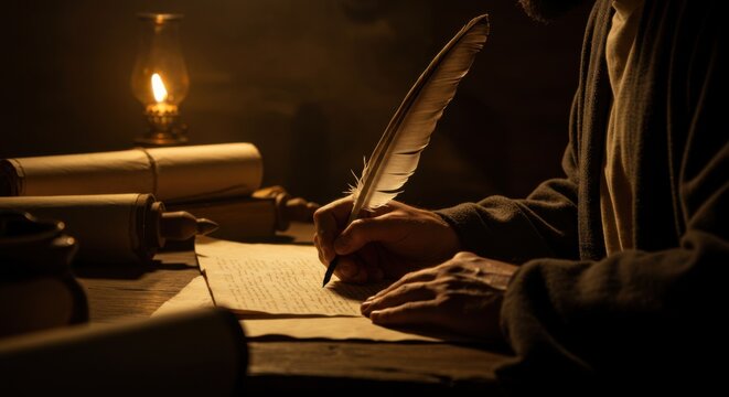 Man scribe writing on old paper scroll with feather pen. Ancient history and biblical record keeping concept.