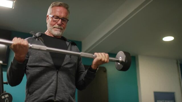 Senior man at the gym doing bicep curls with a bar and weights, with space for text