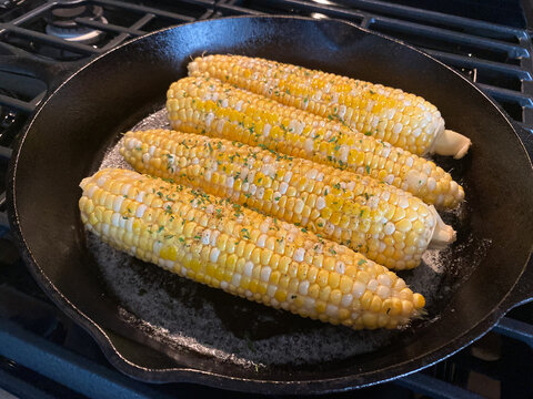 Corn on the Cob Cooking in Cast Iron Skillet