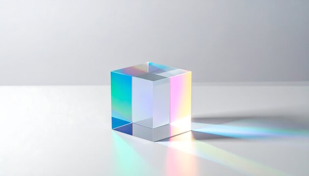 A crystal dichroic cube prism disperses light into a colorful spectrum on a white surface. Minimalist abstract background showing optical physics.