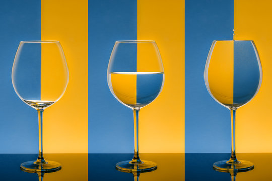Bicchieri allineati su fondo bicolore da vuoto a pieno con goccia di acqua