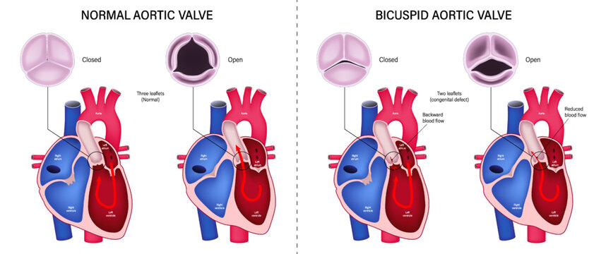 The difference of normal aortic valve and bicuspid aortic valve. Valvular aortic stenosis. Heart anatomy vector. Close-up of normal and abnormal aortic valves.