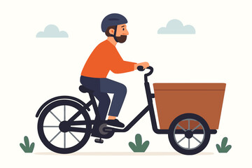 Sustainable urban mobility concept with man on cargo e-bike. Courier character riding electric bicycle for delivery service. Flat design vector cartoon illustration.