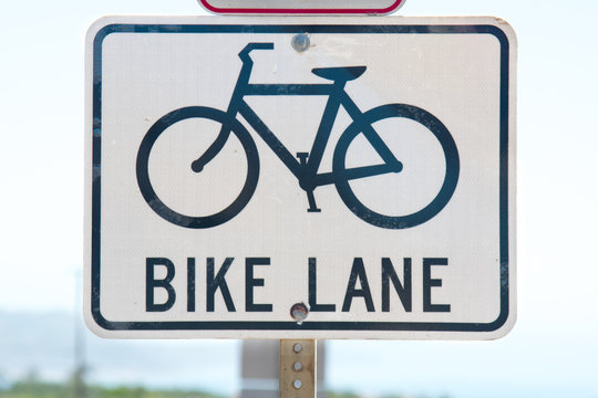 Bike Route green road sign in California, USA. Bicycle lane singpost. Bikeway in Oceanside pacific tourist resort. Cycleway signboard and palm. Healthy lifestyle, recreation and safety cycling symbol