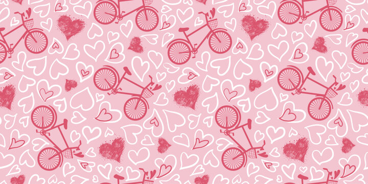 Romantic seamless pattern with bicycle, hearts. Love print, Valentine's Day ornament for fashion textile, wrapping paper. Love background. Vector print