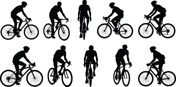 Silhouette cyclists racing on road bikes in various angles, front side rear views, sports motion posture, competitive bicycle vector illustration