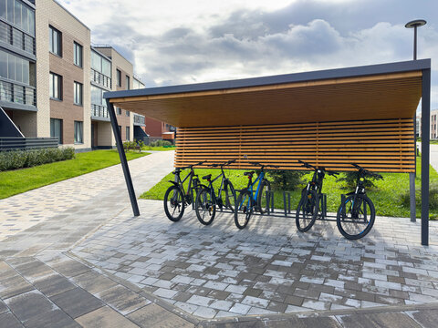 Bicycle garage. Bicycles in a cage on the street. Special garage-cage for bicycles. Bicycle storage device.