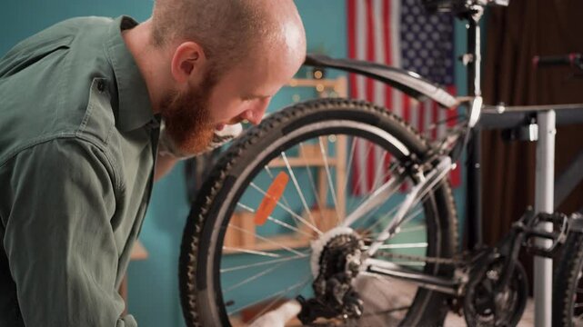 American young bearded man repairing bicycle at home calling technical support hotline consulting with bike repair professional.