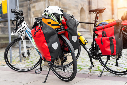 Vector illustration. Travel concept of discovering, exploring and observing nature. Couple hikes, climbs on rock, rides on bike. Adventure tourism. Flat design template of flyer, coupon, voucher, card