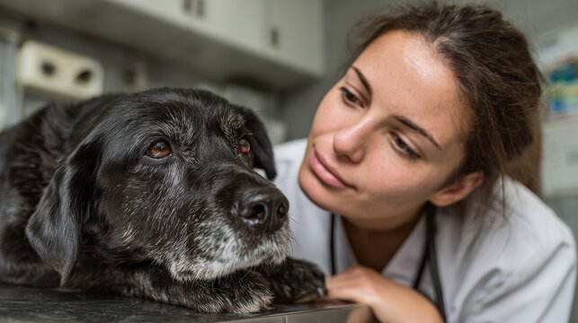 Sad young woman bidding farewell to her ill elderly dog at the vet