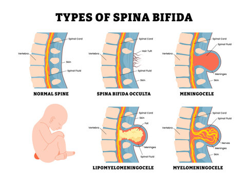 Different types of spina bifida pregnancy, educational medical poster design healthcare, normal spine, occulta, meningocele, lipomyelomeningocele, myelomeningocele. Covered spinal cord, birth defect.