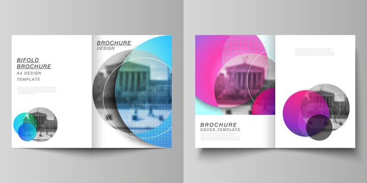 The vector layout of two A4 format cover mockups design templates for bifold brochure, magazine, flyer, booklet, annual report. Creative modern bright background with colorful circles and round shapes