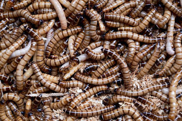 Small pink pearl beads fall on the big pearl beads different colors lying on a gray silk fabric, background, slow motion