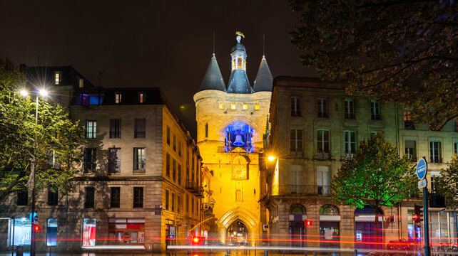 The big bell at night in Bordeaux in New Aquitaine, France