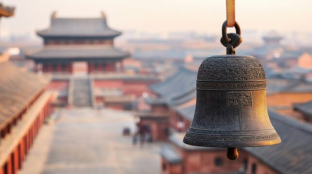 Bell hanging in a temple. Bell Brass bells hanging in the grayish sky background