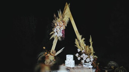 Beautiful wedding cake decorated with dried flowers in the evening near the arch, slow motion.