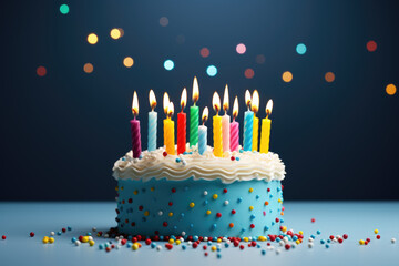 Birthday cake with big fancy burning lit candle number 50. Background for a party or an anniversary celebration with decorations and copy space for text. Vivid blue color tone.