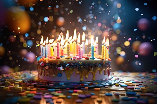 close up homemade birthday cake with candles and bokeh lights, Generative Ai