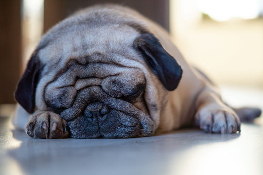 Trauriger Schlafender Mops Hund Beige auf Boden