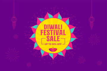 Happy Diwali discounts Upto 50% Off banner with hanging lamp and shiny graphics. Indian festival of light, sale offer, logo design, sticker, concept, greeting card template, icon, unit.