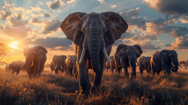Panorama of African elephants (Loxodonta africana) silhouetted at sunset, Maasai Mara National Reserve; Kenya