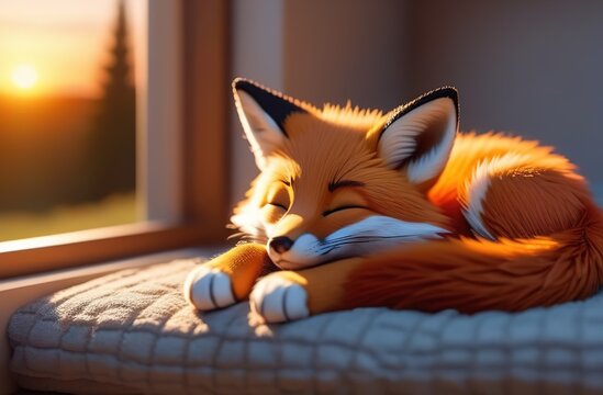 realistic fox with bushy tail and black ears, walking on a dirt path through a forest with tall trees and colorful leaves, with rays of sunlight and mist creating magical atmosphere