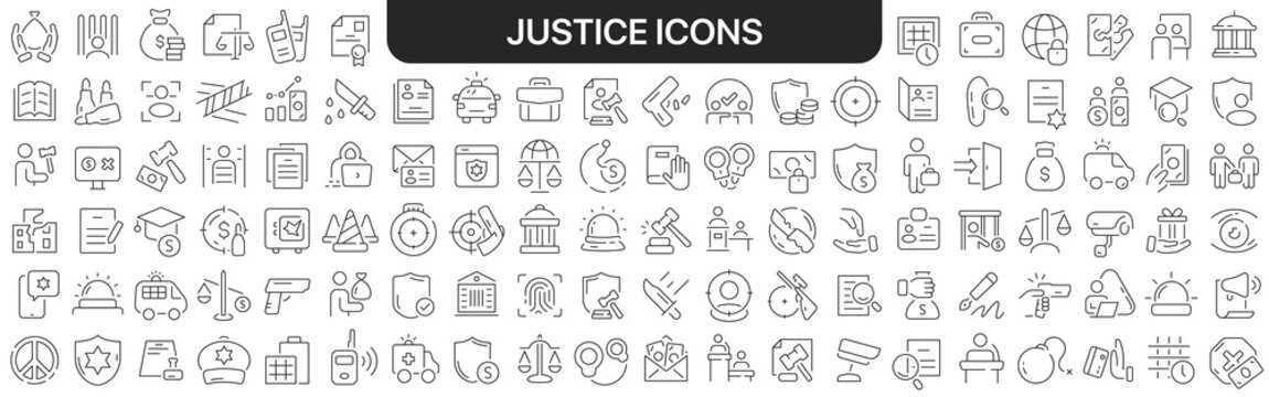 Justice icons collection in black. Icons big set for design. Vector linear icons